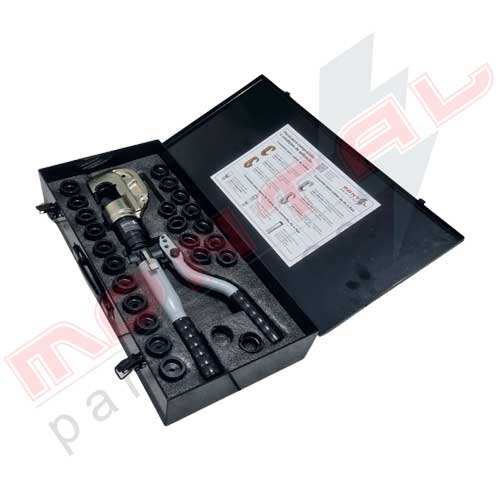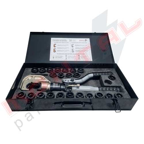 Alicate Crimpador Hidráulico 13 toneladas, indicado para crimpar (prensar) terminais elétricos hexagonais de cobre (Cu) e alumínio (Al) e crimpar (prensar) terminais elétricos redondos de cobre (Cu). Vem em maleta com 1 Alicate crimpador e 24 matrizes.